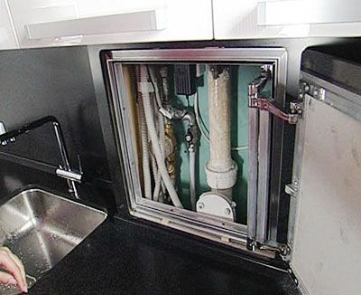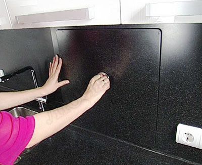 Кухонный фартук из искусственного камня перекрыл доступ к счетчикам воды и газовому крану. Чтобы не переносить коммуникации и обеспечить доступ к приборам, в фартуке оборудовали небольшой замаскированный люк. Его распашная дверца оснащена регулируемыми петлями, а также пыле- и влагоуплотнителем. Собирается такой люк без сварки, а открывается с помощью ручки-присоски.